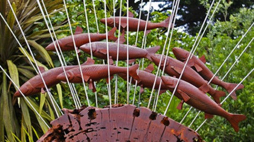 This work represents what has been lost and what may yet be lost if we do not protect our waterways.This fish swimming over the top of the log are life size versions of Upokororo made from an old hardwood wharf pile. Regarded as the most common freshwater fish in New Zealand, Upokororo were a major food source for Maori and are said to have occupied every major river system in New Zealand. In 1869 a mill wheel on the Hutt River was brought to a standstill, choked by thousands of fish. By the time legislation for protection was granted in 1952, the fish were probably already extinct as the last confirmed specimens were taken in 1923. Upokororo is still the only fresh water fish in New Zealand with full protection.